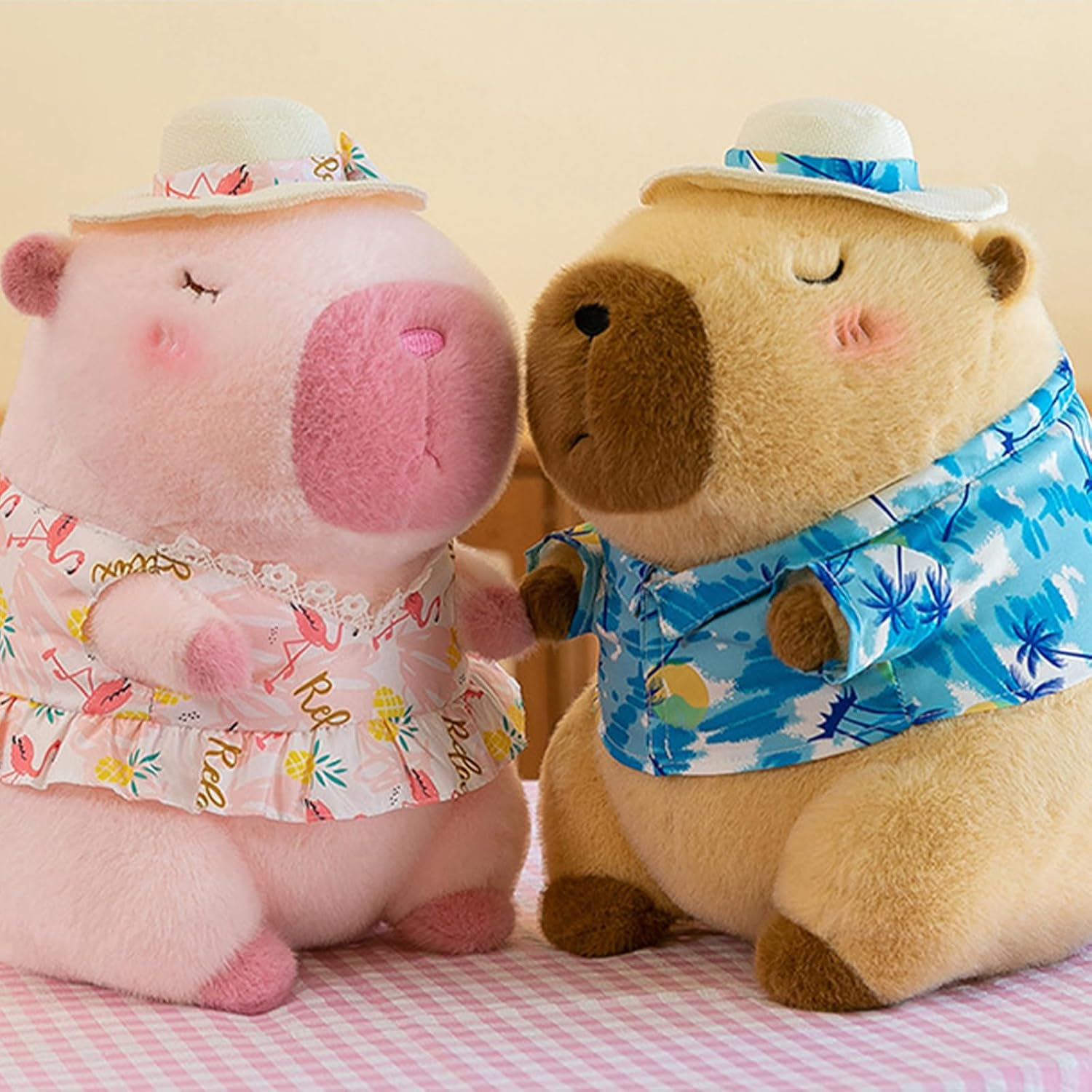 Donning a blue print shirt and a straw hat, the plush capybara toy is made in the fashion of Hawaii. To make the plushies more enjoyable to play with, you can also find that the shirt is detachable. Kids' interest and focus on capybaras can also be piqued by it.