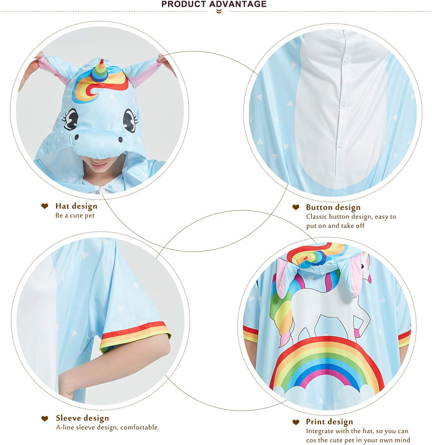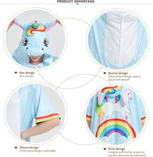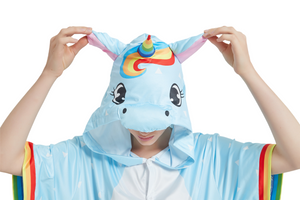 It comes with an all-over plain blue with a unicorn crossing the rainbow at the back. The hood offers fun elements, such as ears, a mane and a colorful horn that matches the rest of the outfit.