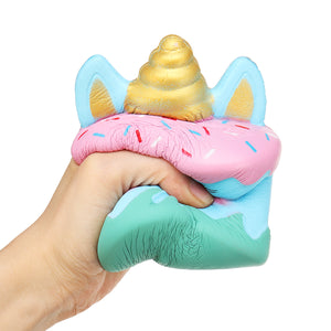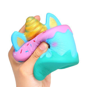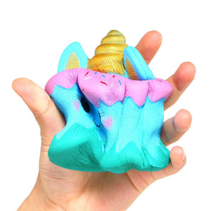 The jumbo-sized adorable, unicorn fantasy ice cream cake squishy toy almost looks like a REAL cake! It's covered in whipped cream looking icing and decorations and has the cute unicorn face! So sweet!!