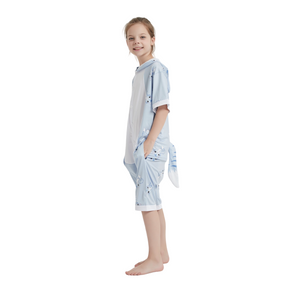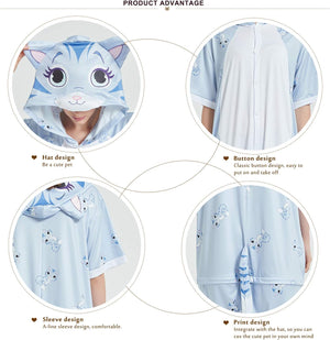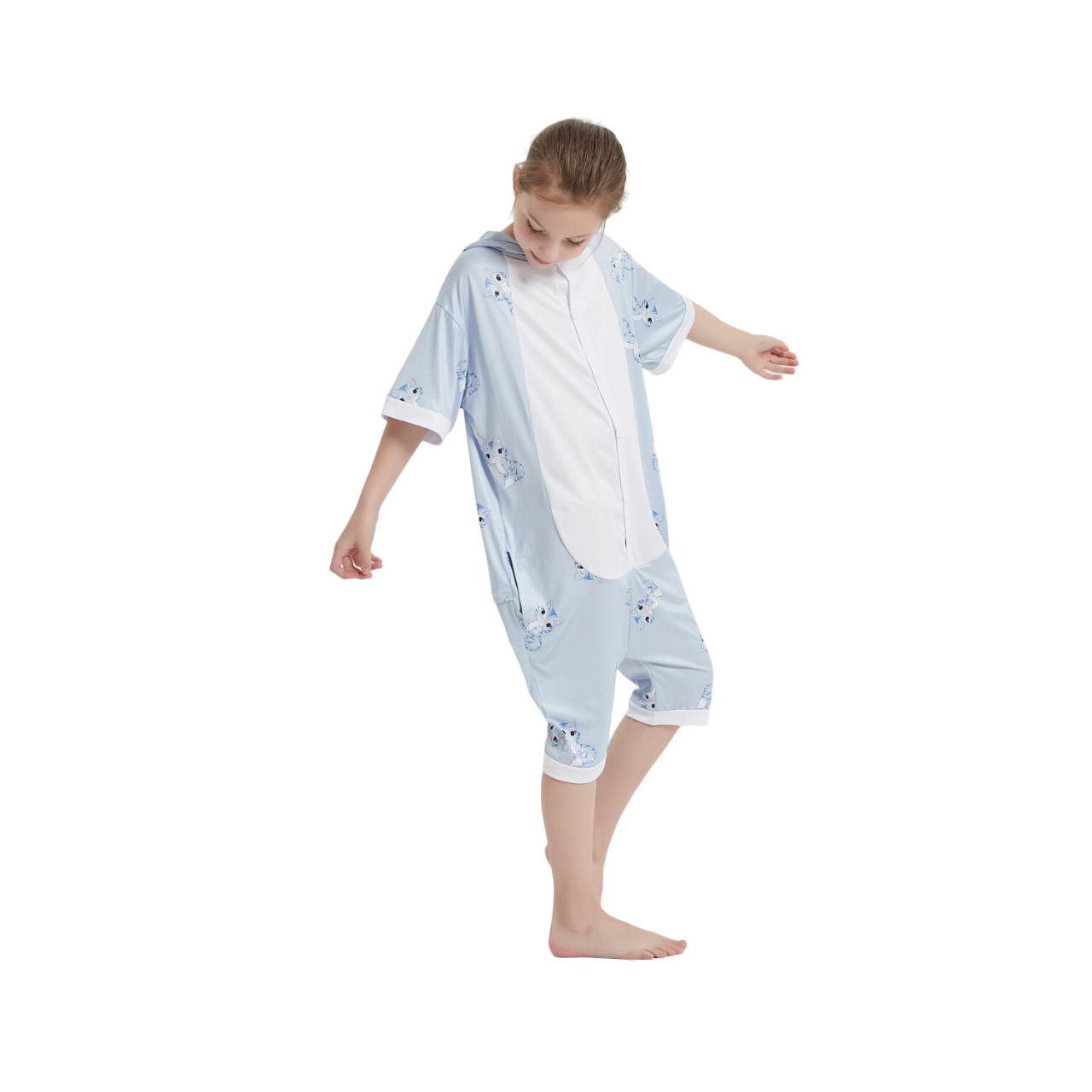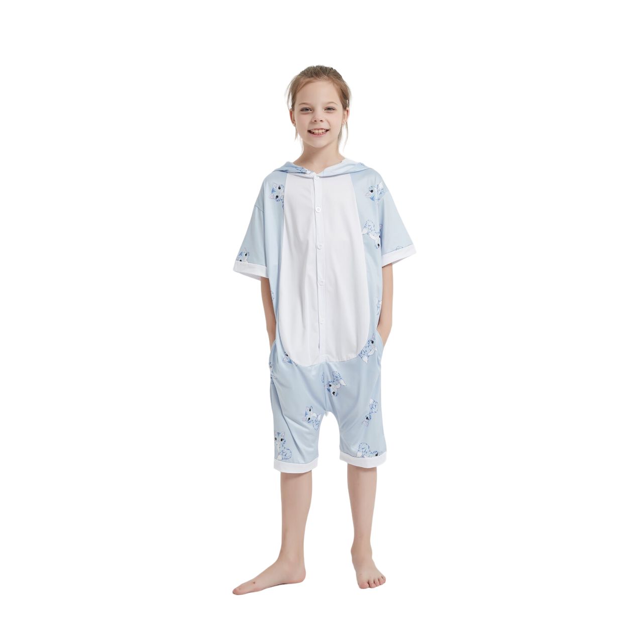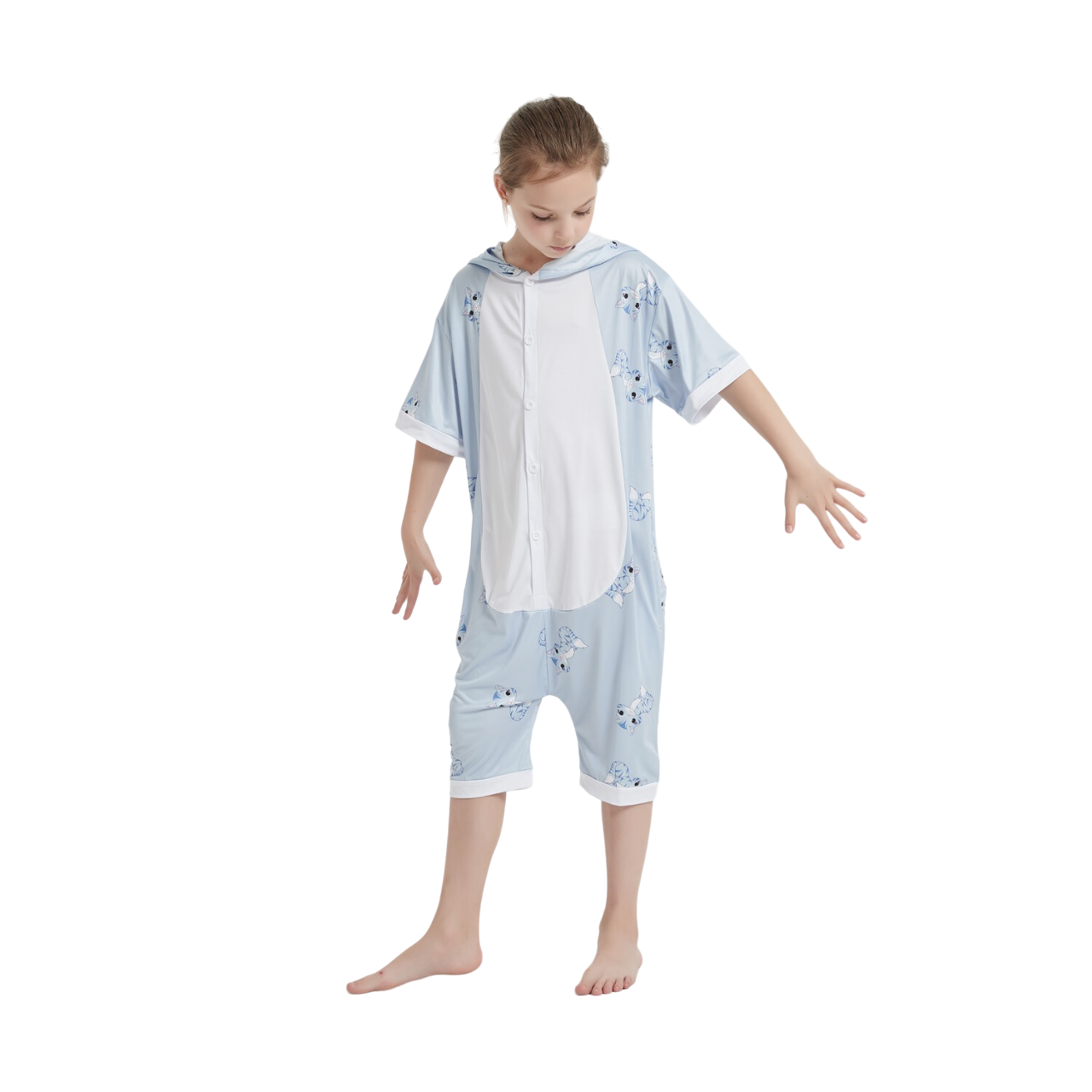 This is a small white and grey kitten with large black eyes. She is very easily distracted and does not have much experience of the world. You can find all kinds of cat trait here: lazy lifestyle and love of fish biscuits. You know what they say about cats, but you will have ALL the luck when you wear this Summer Onesie!
