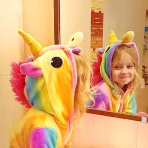 This unicorn bathrobe is in a colorful striped rainbow color. The hood of this coy hoodie features a unicorn face with pink ears, a pink mane and a yellow horn. The costume comes with a rainbow rope. This unicorn costume will keep you warm and cozy while you watch your favorite unicorn movies.