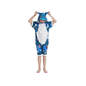 This Dark Galaxy Unicorn Onesie comes in a diagonal stripe pattern in dark blue, black, white and purple. White stars accent the stripes to give the pattern a mystical look. The hood comes with a matching horn, ears, and face.