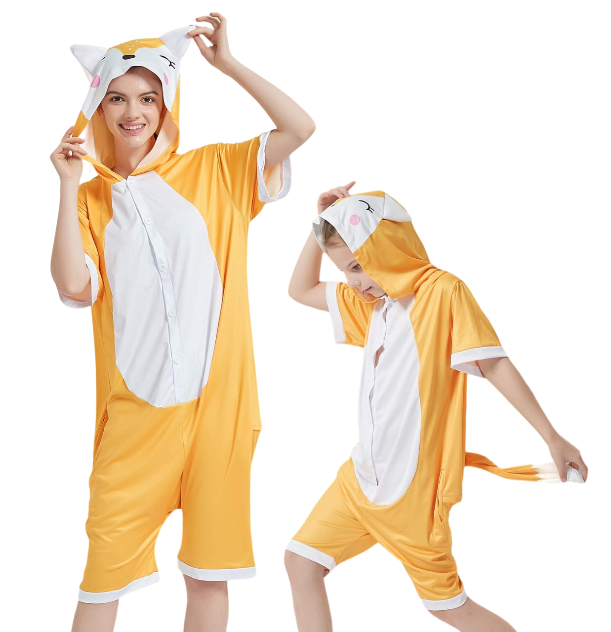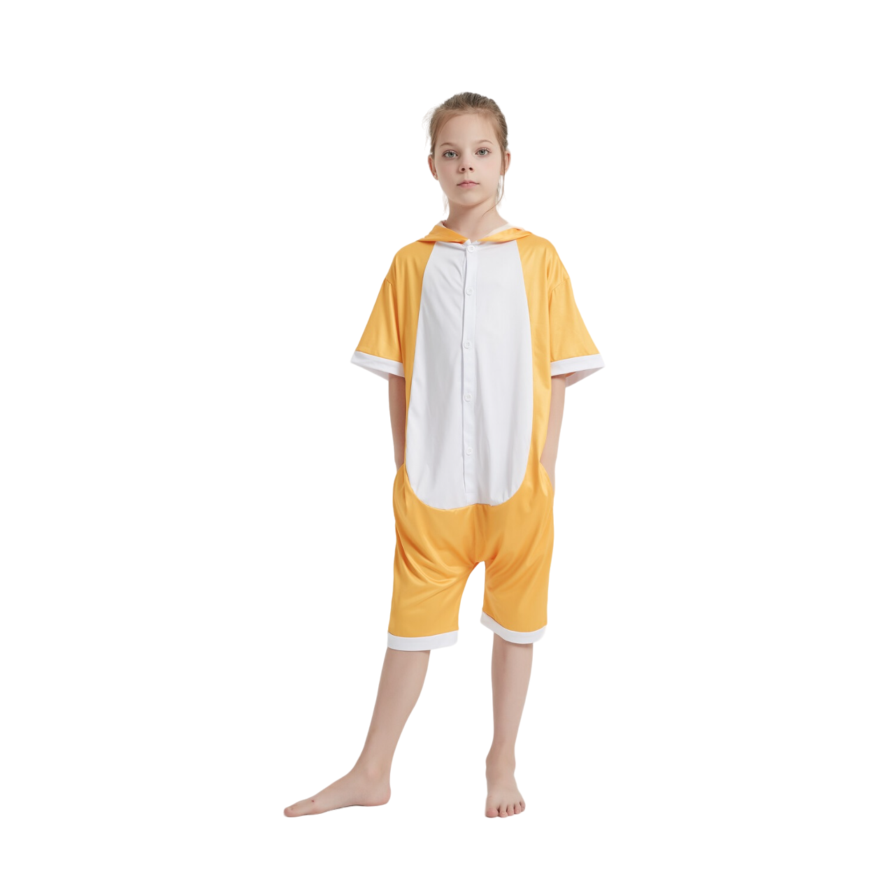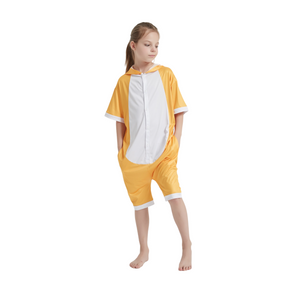 “What does the fox say…?“ Do you want to join in on the foxy fever? Get into it by wearing our adult summer onesies. These yellow-orange short onesies have hoods that have sweet eyes, a dotted face and rosy cheeks. The back has an orange and white tail.