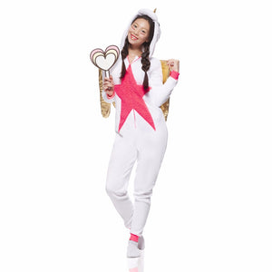 Be ultra-posh and sassy with our women’s golden unicorn onesies. This beautiful onesie has two cute golden wings and two matching wings at the back. It has a big, pink star design and a colorful furry tail.