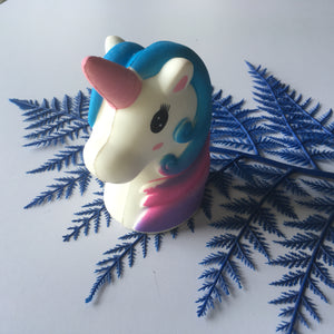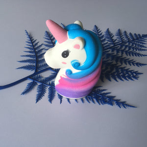 This big and rainbow-colored unicorn has flown here from the fantasy lands to spread the word cuteness around the world! This jumbo-sized squishy is very soft, slow rising and has a slightly sweet scent and especially with a nice galaxy hair along the head. Use the unicorn head squishy for decoration on the bookshelf, as a cuddling companion or just to relieve stress!