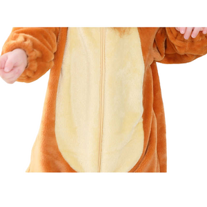 Slip your little one into this furry brown jumpsuit and pop up the hood to reveal the cute shorthaired mane and fuzzy pair of ears. Your kid will surely be the most adorable lion to ever have escaped from the Zoo. This onesie secures with a button in front for easy on and off. A back zipper just below the hips will make it easy for your kid to visit the bathroom when needed.