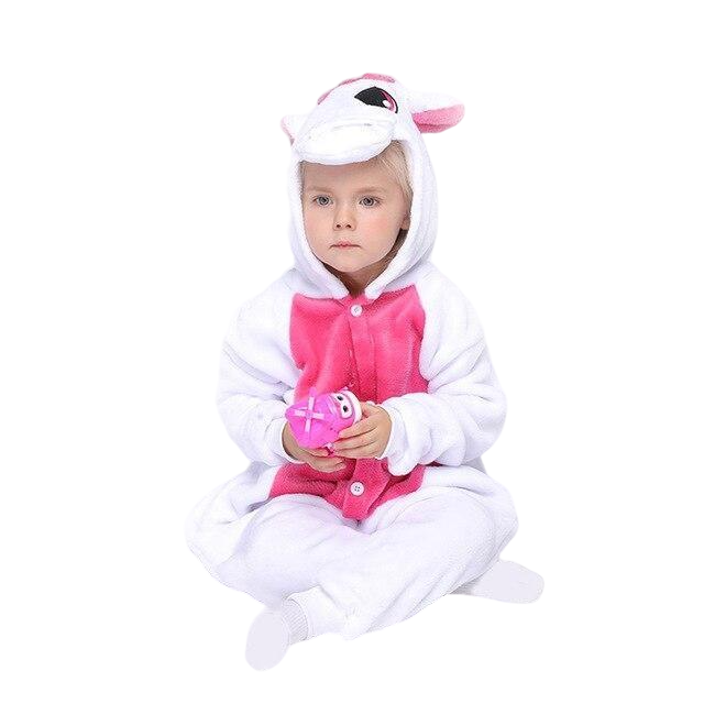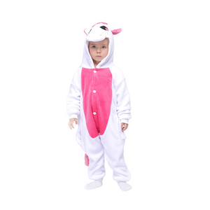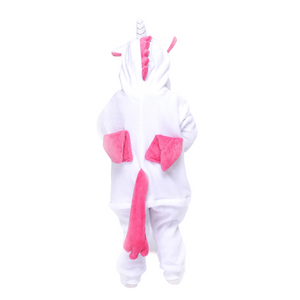 Each onesie features a light purple bodysuit with a pair of pink wings at the back and a pink tail just below them. The pink underbelly also features a full front button closure, and these onesies have lots of pockets: one on each side, and another at the back which you can close with a zipper. Your child will undoubtedly be the cutest unicorn anyone will see when they slip on the hoodie that features a unicorn's face, ears, and a horn. Give your child a magical time with our onesies!