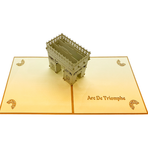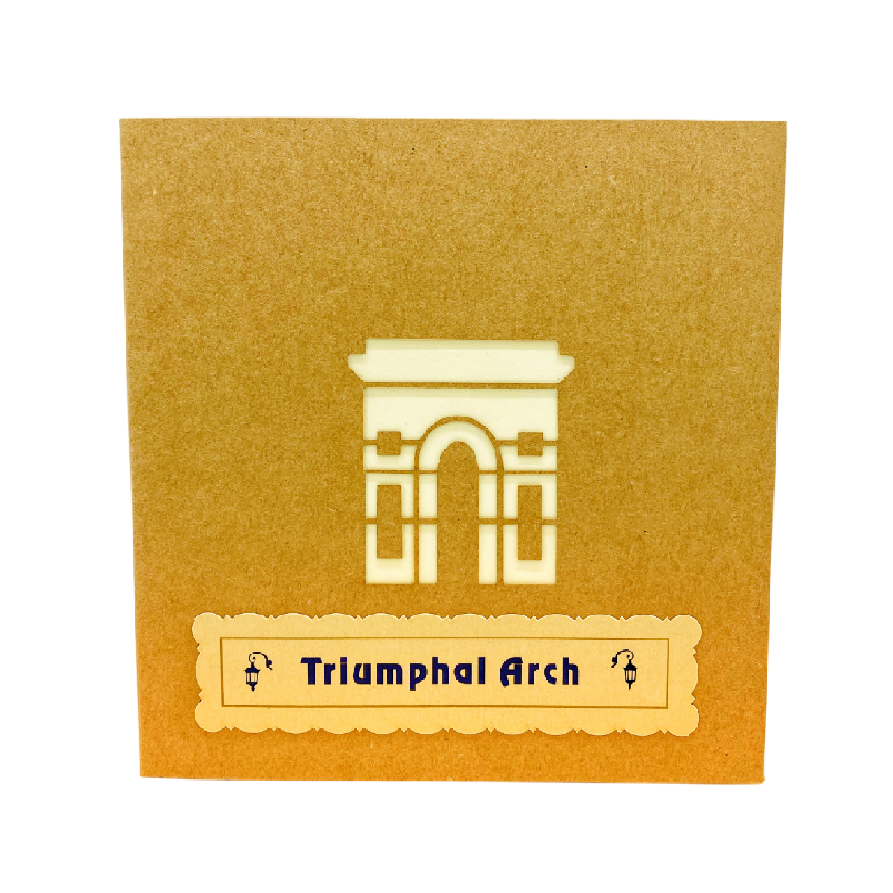 The card has a yellow gradient as the background, and on the lower part of the cover is a printed pattern of the Arc de Triomphe in Paris, with “Triumphal Arch” written under it. The inner page of the card is light cream and in the middle of the inner page is a 3D laser triumphal arch. It is assembled from six flat laser patterns.