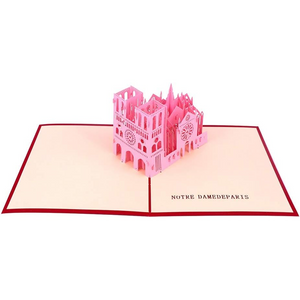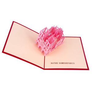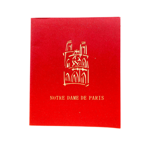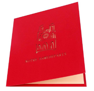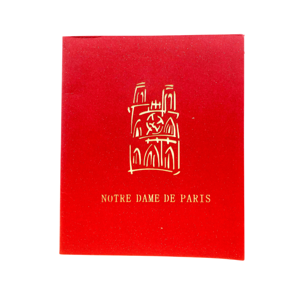 Cover: Featured on the red base is a meticulous laser – cut picture of Notre Dame De Paris Pop up card. Below is the name of landmark which also is laser cut.