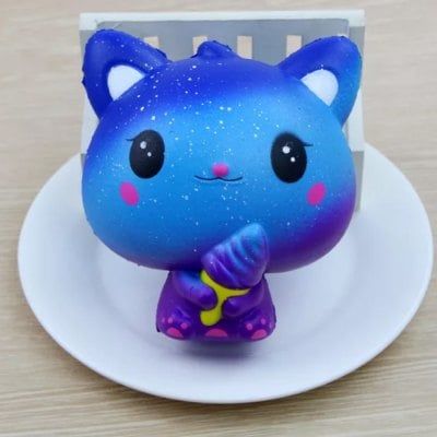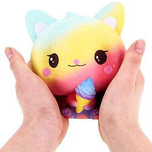 Here kitty kitty! This slow-rising and slightly scented kitten squishy needs a home. They are so cute with a big head and and holding ice cream by both hands! Such a cute little pacifier to make you go aww! They come in two different colors: rain bow & galaxy. Pick your favorite and bring this little cute mate home with you.
