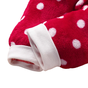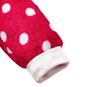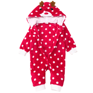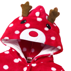 Each onesie is a deer-inspired design featuring a red body with polka dots, gartered wrist and ankle cuffs with a white underbelly, and an embroidered hoodie with plush ears and antlers.