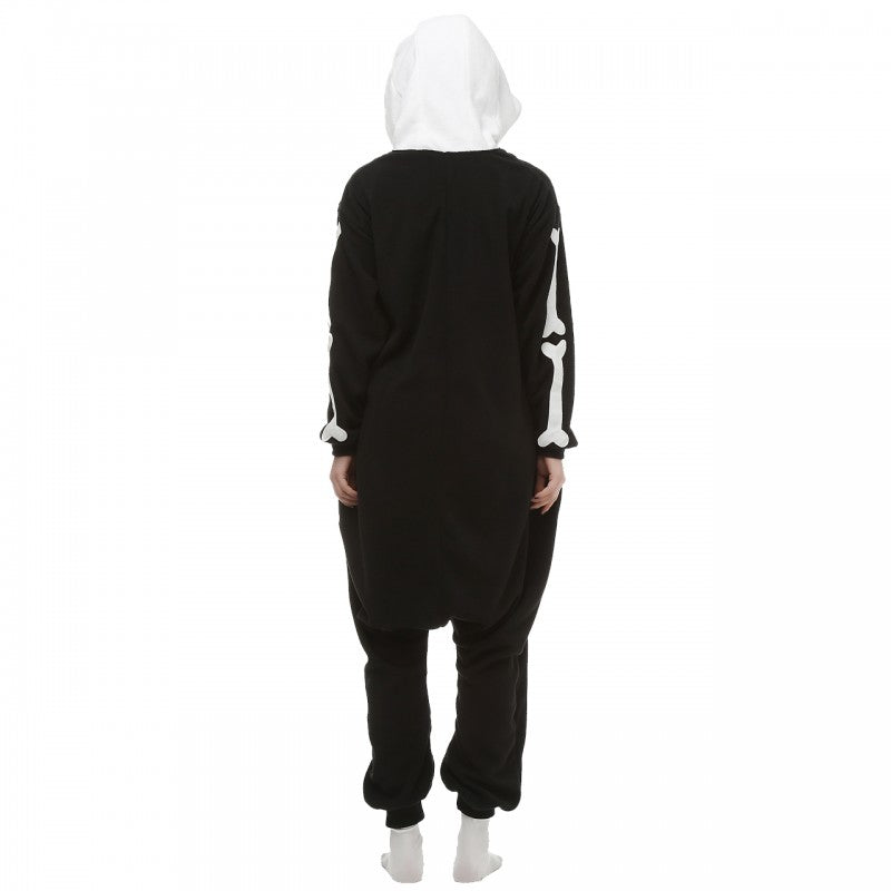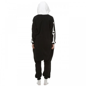 Our onesie has a black background and a white skeletal outline for its body. The hood is designed with a skeletal head, complete with two pitch black eyes; it carries a white background to make the details pop out.