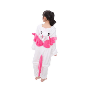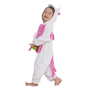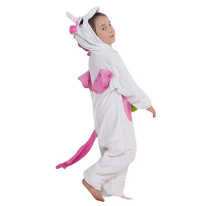 Each onesie features a light purple bodysuit with a pair of pink wings at the back and a pink tail just below them. The pink underbelly also features a full front button closure, and these onesies have lots of pockets: one on each side, and another at the back which you can close with a zipper. Your child will undoubtedly be the cutest unicorn anyone will see when they slip on the hoodie that features a unicorn's face, ears, and a horn. Give your child a magical time with our onesies!