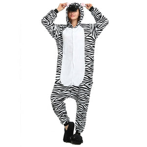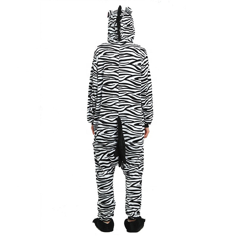 Look great in black and white stripes with a zebra-themed onesie! This adult pajama suit is a hundred percent flannel, it has a super soft plush feel that will keep you warm and cozy. Button closures secure the front for easy on and off. The hood features three-dimensional zebra facial features like a nose, and mane, and the feature embroidered details. Designed to be extra baggy and sized for adults.